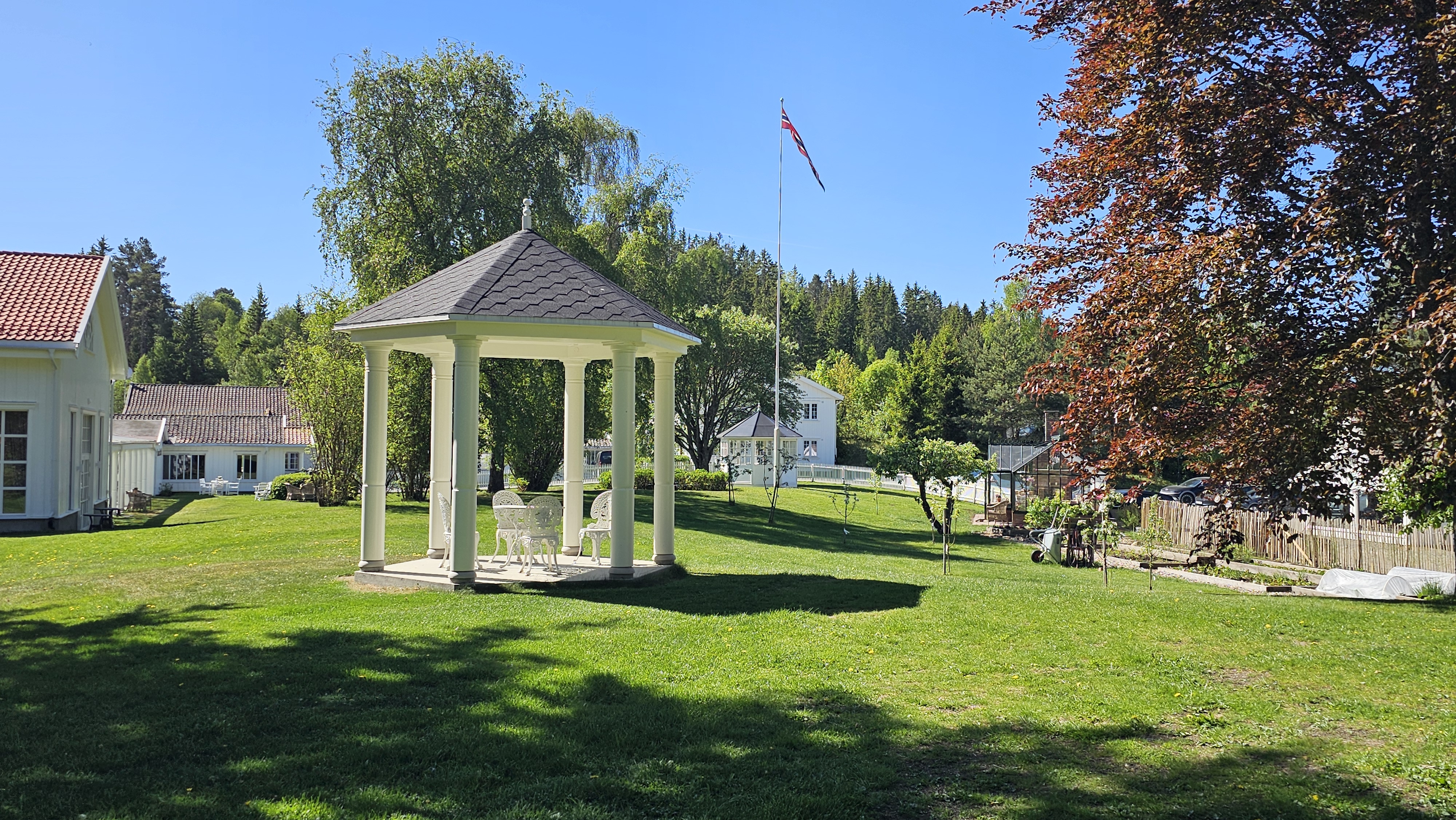 I hagen kan du både slappe av og du kan være aktiv. Her er det plass for både bespisning, vielse, aktiviteter og spill, eller kanskje du bare vil nyte stillheten og fuglekvitter med en god bok.