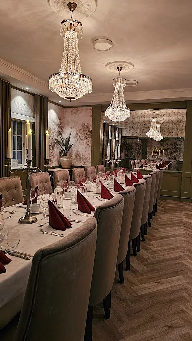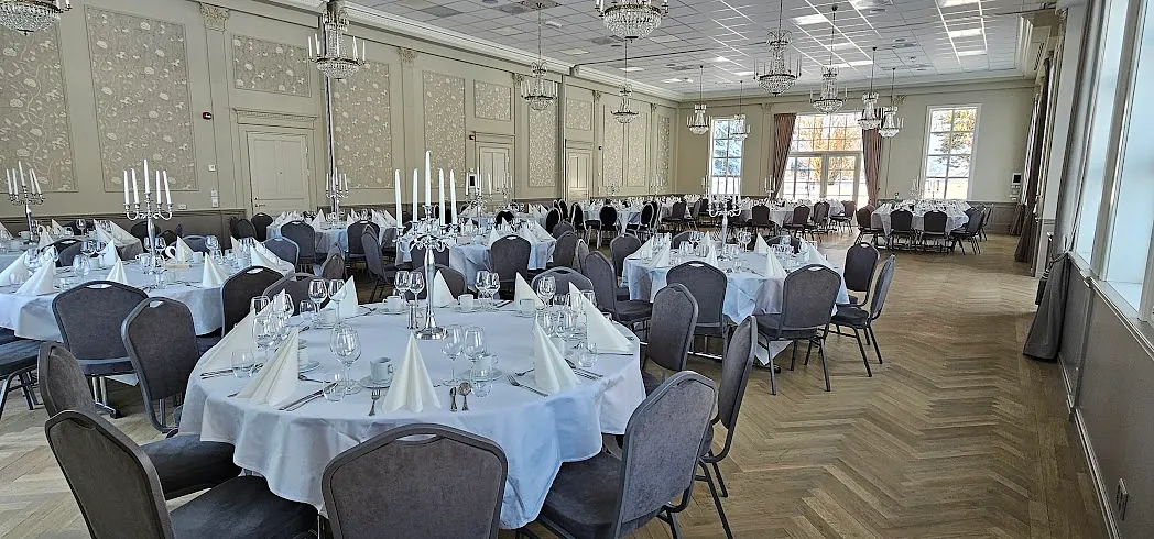 Om du virkelig ønsker storslåtte omgivelser og mange gjester, er vår nye bankettsal det rette valget. Her er det høyt under taket, flotte detaljer, lysekroner og direkte utgang til hagen. Her er det moderne teknisk utstyr, om du eksempelvis ønsker å vise bilder eller film som alle skal se. Vi kan dele salen i to eller tre, og tilpasse størrelsen alt etter hvor mange dere er.