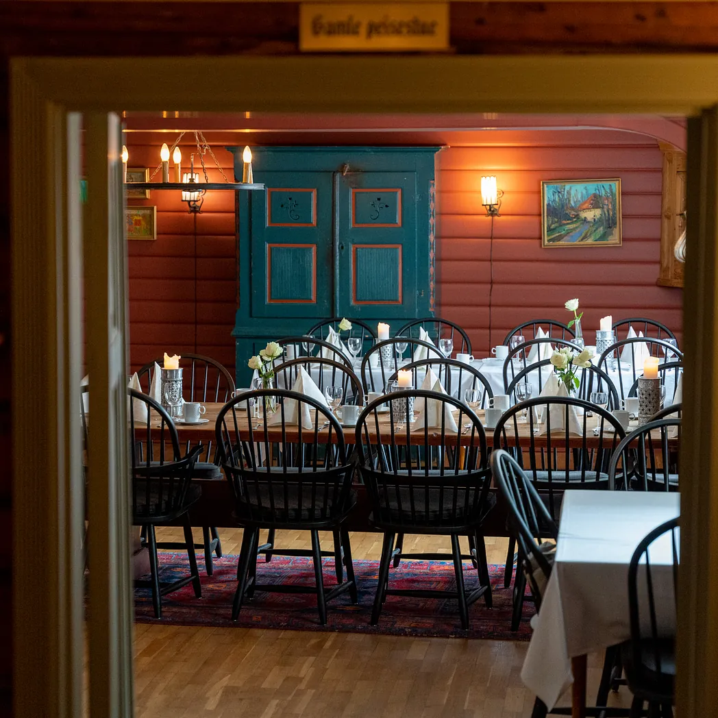 Gamle peisestue er en koselig spisestue med plass til 32 personer. Her kan vi dekke opp til fest, eller by på et avslappet og uformelt måltid.